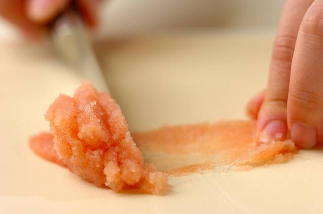 <タラコソース>のタラコは薄皮に切り込みを入れ、包丁の背で中身を取り出し、他の材料と混ぜ合わせる。