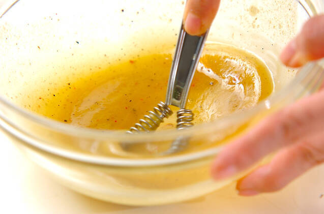 <ドレッシング>を作る。ボウルに玉ネギ以外の材料を入れ泡立て器でトロ~ンとするまで混ぜ合わせ、玉ネギを加え合わせる。