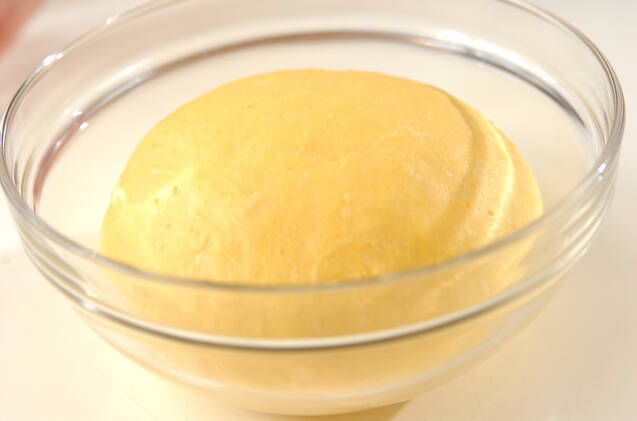 <フィンガーテスト>生地が2倍くらいの大きさに膨らんだら、生地に粉を付けた指を入れて抜く。あいた穴がふさがらなければ一次発酵は完了。穴がふさがってしまう場合は発酵不足なので発酵時間を延長する。