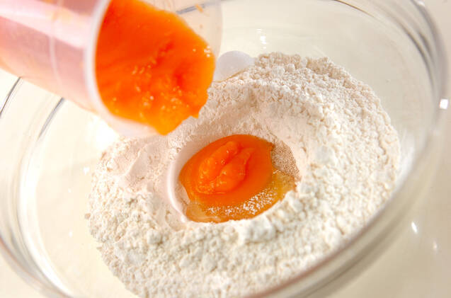 <ニンジンペーストを加える>ニンジンペーストの1/3量を粉の真ん中に注ぎ入れ、インスタントドライイーストとハチミツをよく溶かす。