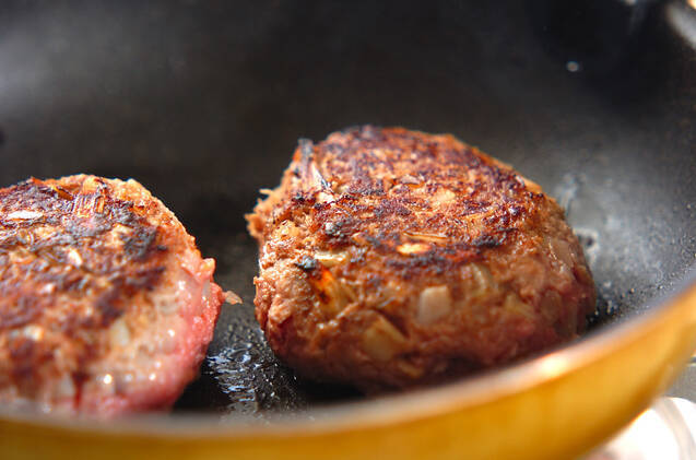 焼き色がついたら、ハンバーグをひっくり返して少し焼き色をつける。弱火にしてフライパンに蓋をし、5~6分蒸し焼きにする。ハンバーグはお皿に盛る。