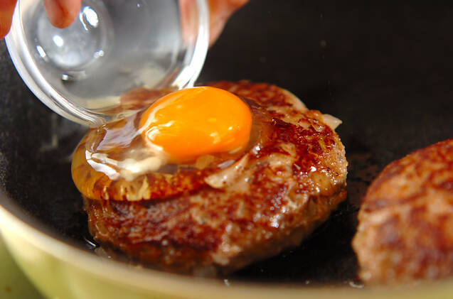 フライパンに残りのサラダ油を熱し、強めの中火でハンバーグを入れ、両面色よく焼く。弱火にし、フライパンに蓋をして3~4分蒸し焼きにし、中まで火を通す。中央の穴に卵を割り入れ、再び蓋をして3~4分蒸し焼きにし、取り出す。