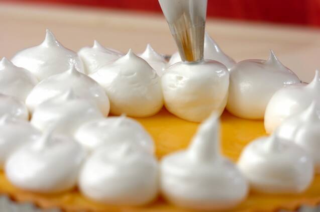好みの口金をセットした絞り袋に<メレンゲ>を入れ、タルトの上に均等に絞り出す。