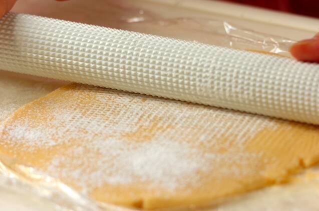 冷蔵庫から出したら少しこねて柔らかくし、分量外の小麦粉で軽く打ち粉をし、麺棒で厚さ7mm程、タルト型より一回り大きく伸ばす。