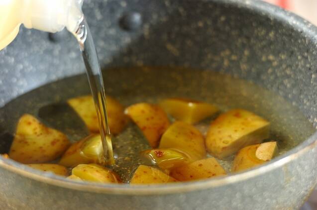 新ジャガイモは皮ごと小さなひとくち大に切ってフライパンに並べ、揚げ油をヒタヒタに注いで中火にかける。