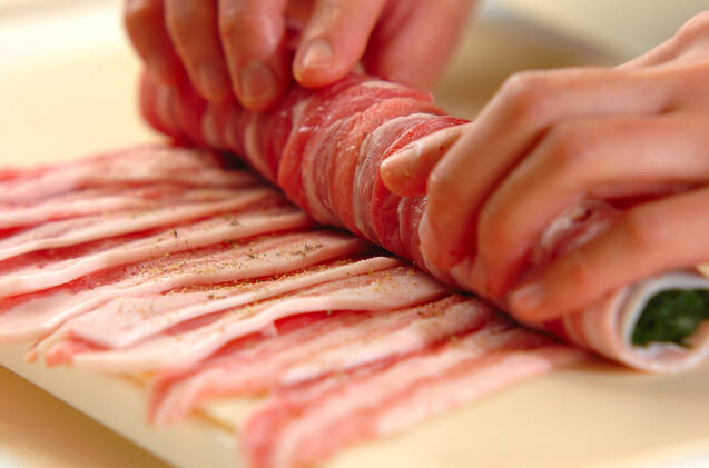 豚バラ肉を少し重ねながら全量広げ、塩コショウを振る。豚肉の長さに合わせてニラを切り、豚肉の手前にのせて巻く。