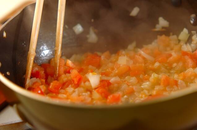 フライパンに玉ネギ、ニンニク、サラダ油を入れて中火で炒め、しんなりしたらトマトを加えて水分を飛ばすように炒め合わせる。