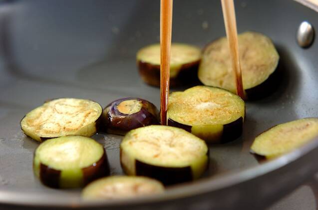 フライパンにオリーブ油を多めに入れて、中火で熱してナスを加える。柔らかくなるまで両面を焼く。(2)に加えて、サッと煮る。