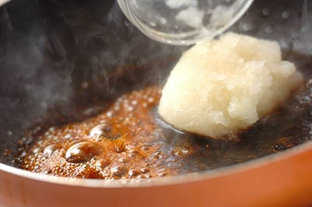 (1)、(2)とブロッコリーを器に盛る。フライパンに<ソース>のしょうゆとみりんを入れてひと煮たちさせ、大根おろしを加えてサッと煮、豚肩ロース肉にかける。