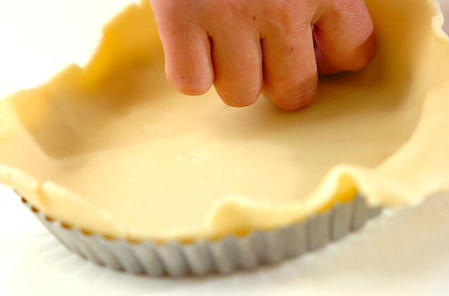 (2)の<タルト生地>を、ラップの上から厚さ3~4mmに伸ばして型に敷く。