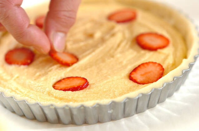 (4)に(3)の<クレーム・ダマンド>を入れてまんべんなく伸ばし、薄く切ったイチゴを1~2個分のせ、200℃に予熱しておいたオーブンで約30~35分焼く。