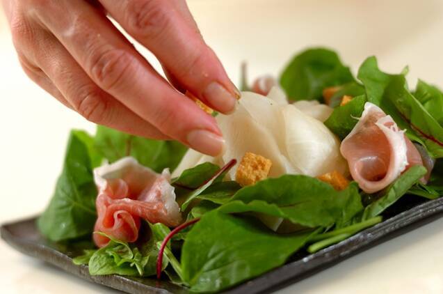 器にカブ、ベビーリーフ、生ハムを盛り合わせ、クルトンを散らしてドレッシングをかける。