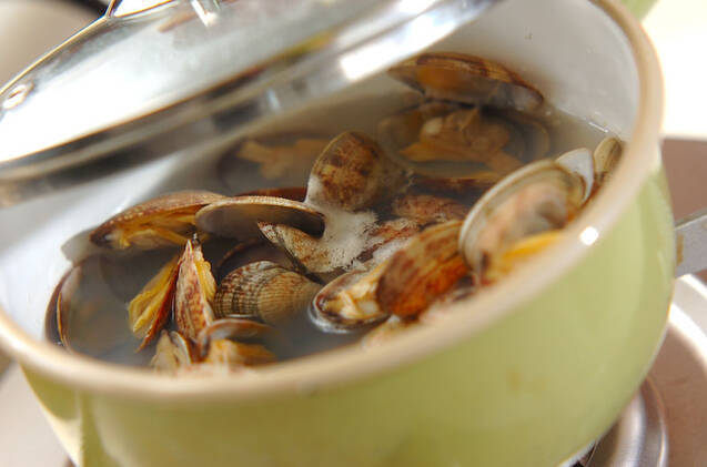 鍋にアサリと水を入れて蓋をし、火にかける。全ての殻がしっかり開いたら火から下ろし、そのまま置く。