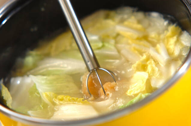 白菜の葉を加え、火を弱めて白みそを溶かし、牛乳と生クリームを加えてひと煮たちさせる。