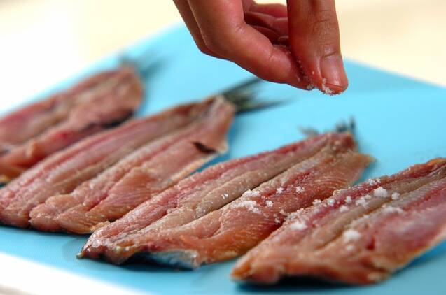 頭側の骨の上に親指を差し込み、骨にそって尾に指を滑らせ、イワシを開く。尾の付け根で骨を折り、頭に向かって骨をはがすように取る。サッと水洗いして水気を拭き取り、塩を振る。
