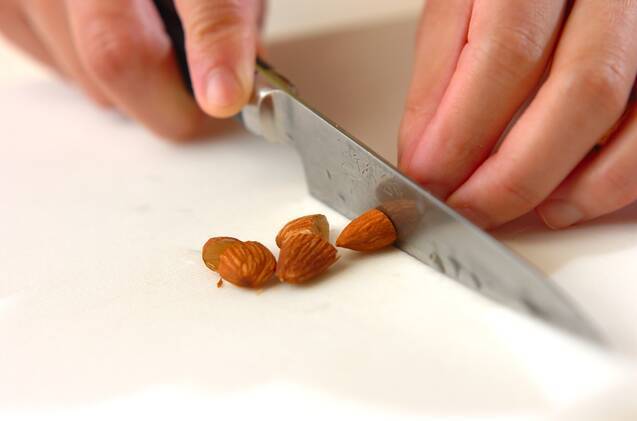 マンゴー、パイナップルはひとくち大に切る。ナッツは包丁で半分程度の大きさに砕く。