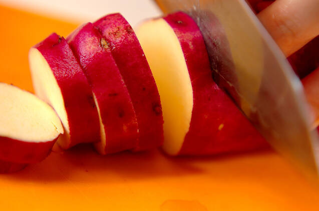 サツマイモは皮付きのままきれいに水洗いし、厚さ7~8mm輪切りにして、かぶる位に水を入れて火にかける。