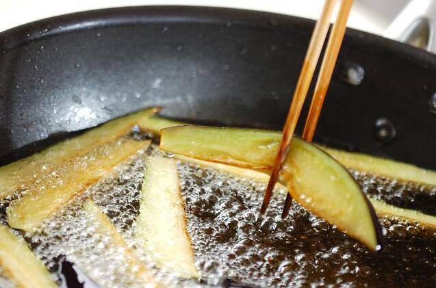 170℃の揚げ油にナスを入れ、少ししんなりするまで揚げ、油をきる。揚げ油はあける。
