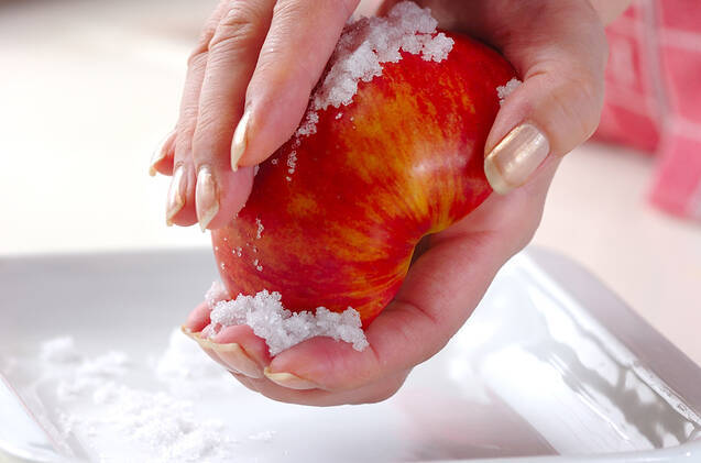 リンゴは塩で皮を洗い、きれいに水洗いして芯を取り、キュウリくらいの大きさに切る。