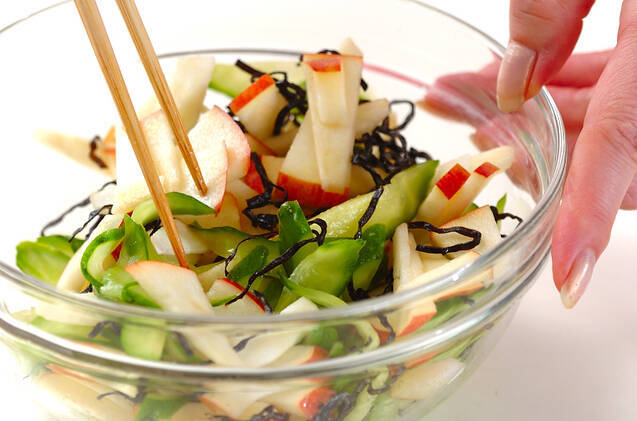 ボウルにキュウリ、リンゴ、塩昆布を和え、器に盛る。
