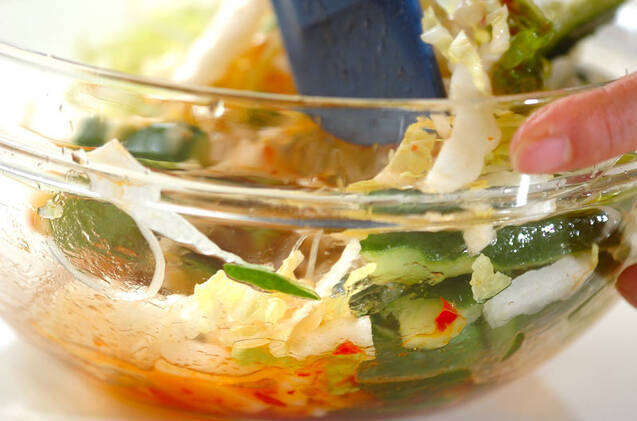 <漬けダレ>の材料をボウルに混ぜ合わせ、キュウリ、白菜、白髪ネギを加えて和え、少ししんなりしたら器に盛る。