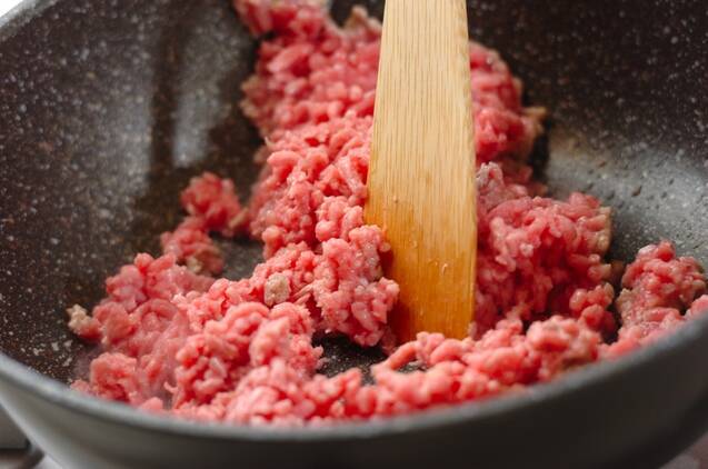 フライパンに豚ひき肉とショウガ、ニンニクを入れて中火にかけ、豚ひき肉をほぐしながら炒める。