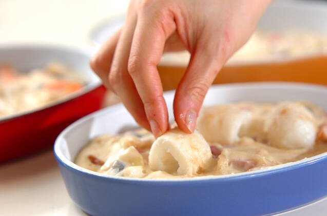 <ホワイトソース>と(3)の炒め物を混ぜ合わせ、耐熱容器に盛り分ける。きりたんぽをのせ、ピザ用チーズを散らす。 250℃に予熱しておいたオーブンで12~15分、おいしそうな焼き色がつくまで焼く。(ヒント)きりたんぽはソースからでていると少し固くなります。