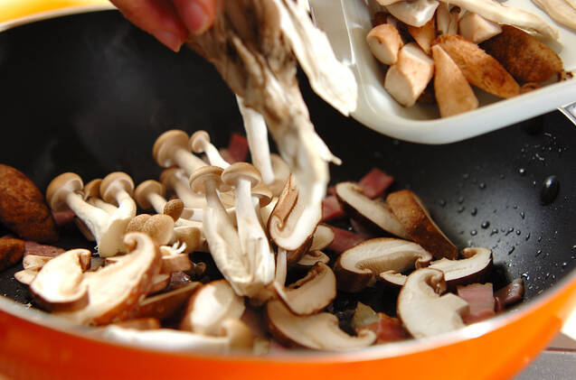 シメジ、マイタケ、シイタケを加えて塩コショウをし、全体にしんなりするまで炒め合わせる。