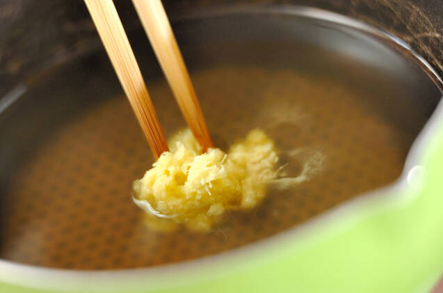 再び煮たったら<水溶き片栗>をまわし入れ、トロミがついたら火を止める。粗熱が取れたらショウガを加えて、冷蔵庫で冷たく冷やす。(ヒント)調理時間に冷やす時間は含まれていません。
