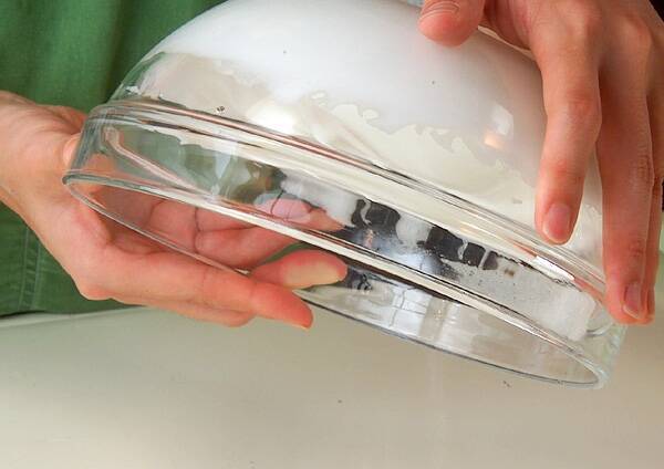 油分をしっかり洗い、水気をしっかり拭き取ったきれいなボウルに、卵白2個分と残りのグラニュー糖を加え、ハンドミキサーで泡立てる。ボウルをひっくり返しても落ちないくらいしっかり泡立てる。(メレンゲ)