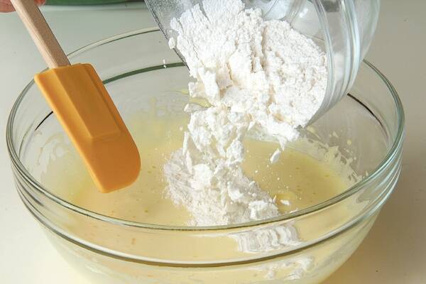 合わせた粉を1に一気に加え、ゴムベラでさっくり混ぜ合わせ、溶かしバター、バニラエッセンスを加えて手早く混ぜ合わせる。2のメレンゲを半量加えてなじませるように混ぜ合わせ、残りのメレンゲを加え、泡をつぶさないようにサックリと混ぜ合わせる。