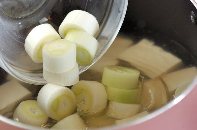 鍋にだし汁を入れて強火にかけ、煮たったら豆腐、白ネギを加える。