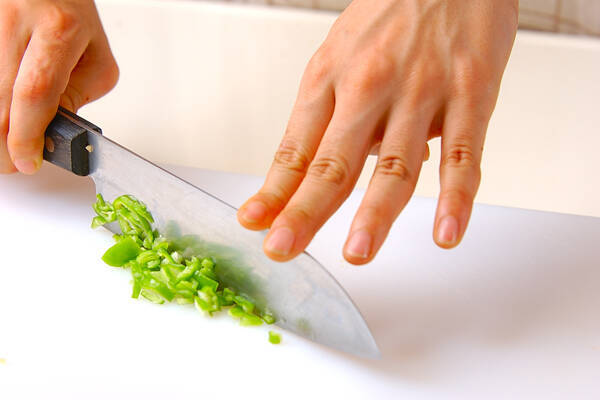 長唐辛子は水洗いして水気を拭き取り、ヘタを切り落として縦半分に切って種を取り、みじん切りにする。
