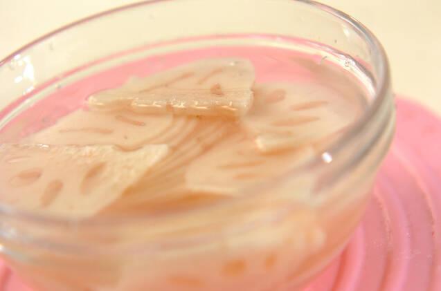 レンコンは皮をむいて縦半分に切り、さらに薄い半月切りにして水に放つ。