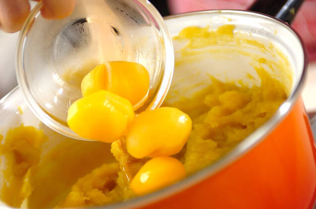 残りの砂糖を加え、さらに練り混ぜ、つやが出てポッテリしたら栗を加え、塩を加えて味を調える。(ヒント)サツマイモの固さは、ゆで汁で調整してください。