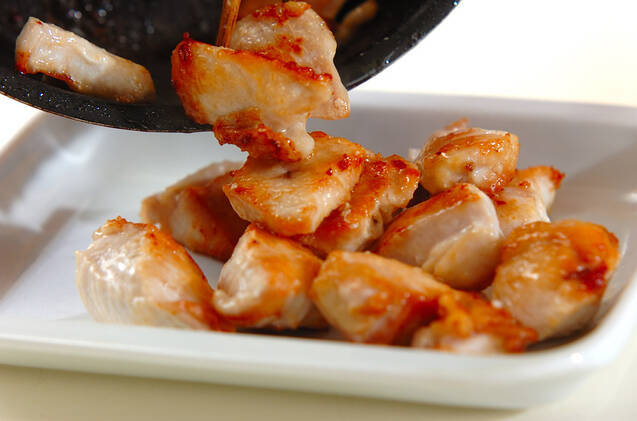 鶏むね肉はひとくち大の斜め削ぎ切りにし、小麦粉を薄くまぶす。フライパンにサラダ油をひいて火にかけ、焼き色がついたら取り出し、冷ましておく。