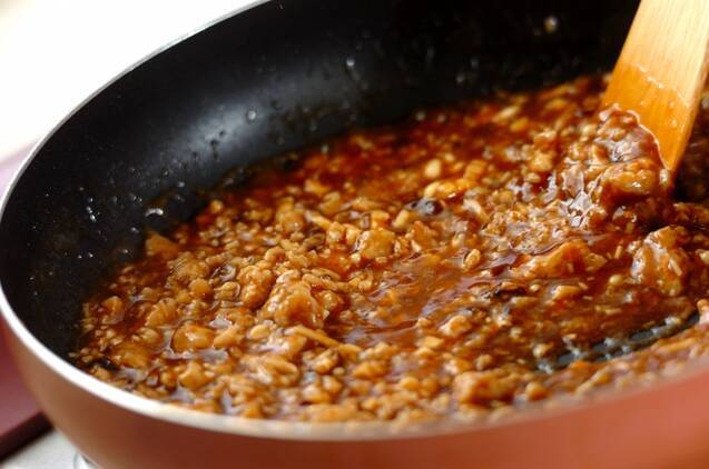 フライパンにゴマ油を中火で熱し、鶏ひき肉を炒める。シイタケ、エノキ、<調味料>を加えて炒め合わせる。