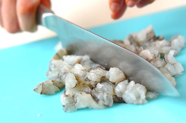 レンコンは皮をむいて厚さ5mmの輪切りにし、酢水に放つ。
