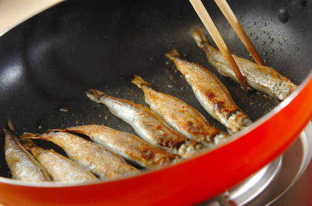 フライパンにサラダ油を中火で熱し、シシャモを焼いて器に盛る。