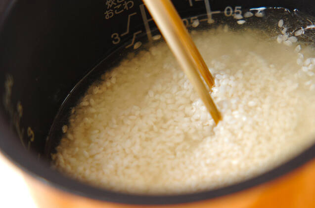 炊飯器にお米、だし汁、酒、塩を入れ、ひと混ぜしてからスイッチを入れる。