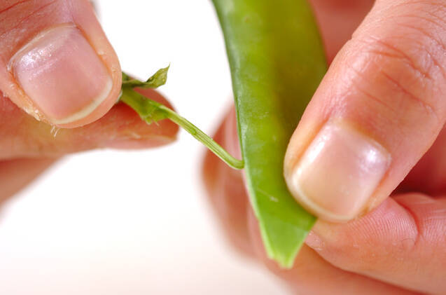 キヌサヤは筋を引いて、エンドウ豆はサヤから出し、それぞれ塩を入れた熱湯でゆでザルに上げる。