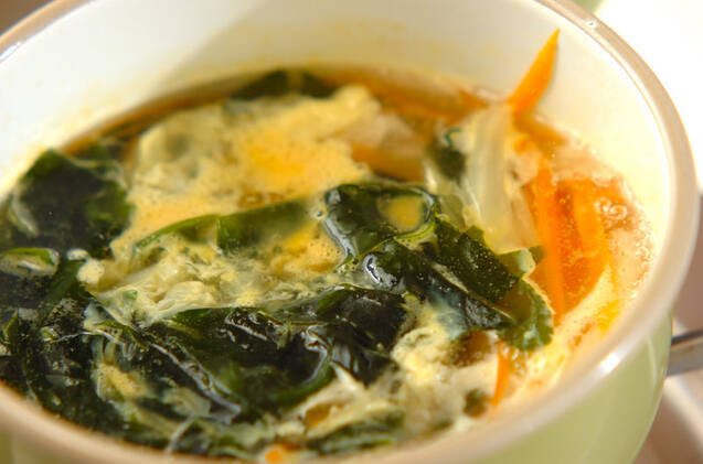 煮たったら吹きこぼれないくらいの強めの火加減で1~2分煮、ワカメを加えて溶きほぐした卵を加える。卵がフンワリと浮いてきたら塩コショウで味を調え、器に注ぎ分ける。