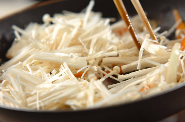 (1)のフライパンに残りのサラダ油を足し、ニンジン、玉ネギを炒め、しんなりしたらエノキを加えてさらに炒める。