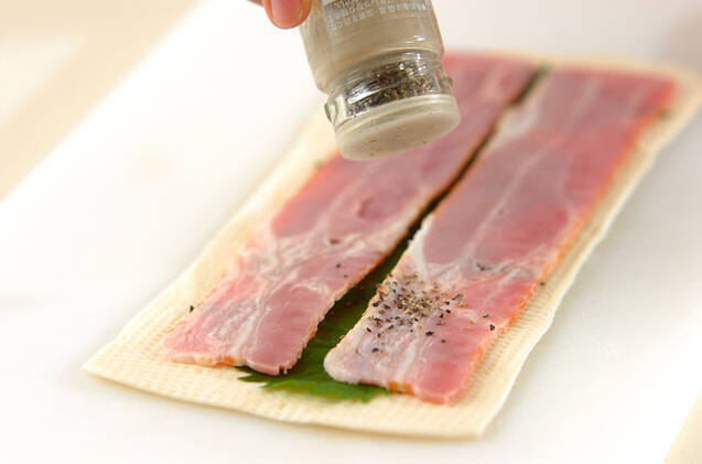 パイシートの上に大葉、ベーコンをのせ、粗びき黒コショウを振る。