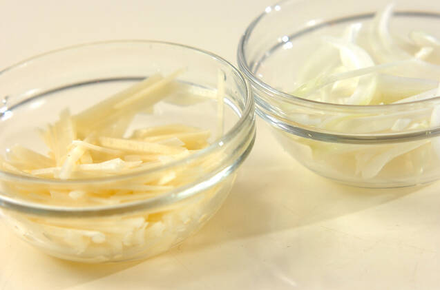 ジャガイモは皮をむいてせん切りにし、サッと水に放って水気をきる。