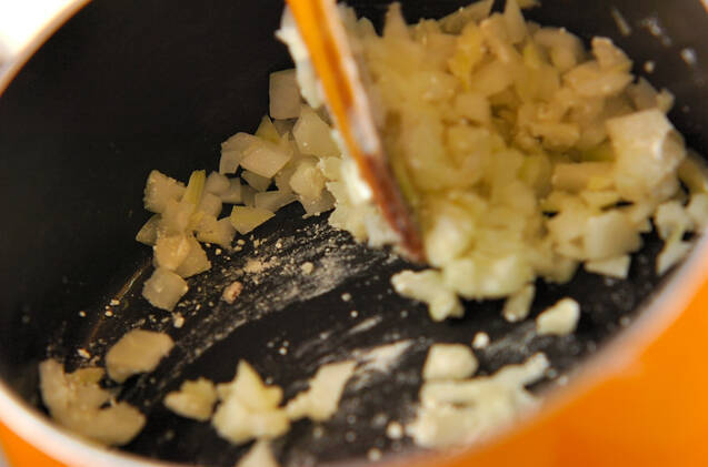 鍋にバターを溶かして玉ネギを炒め、小麦粉を加えて炒め合わせる。