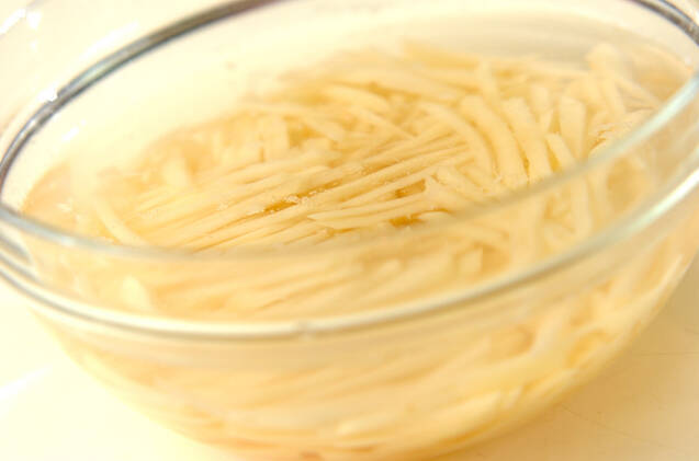 ジャガイモは皮をむいてせん切りにし、水に放ってザルに上げ、水気をきる。