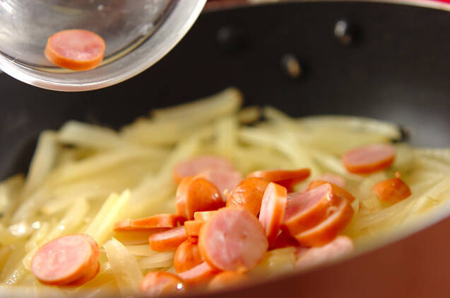 フライパンにオリーブ油を熱してジャガイモを炒め、まわりが透明になったらソーセージと赤唐辛子を加え、炒め合わせる。