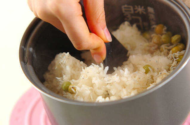 炊き上がったら10分そのままで蒸らす。全体に軽く混ぜ合わせて余分な水分を飛ばし、茶碗によそう。