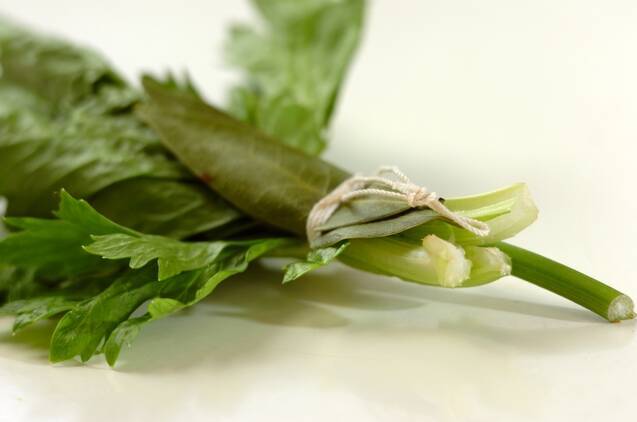 セロリは葉を切り落とし、筋を引いてニンジンに合わせて切り、切り落としたセロリの葉、パセリの軸、ローリエをタコ糸でくくり、ブーケガルニを作る。